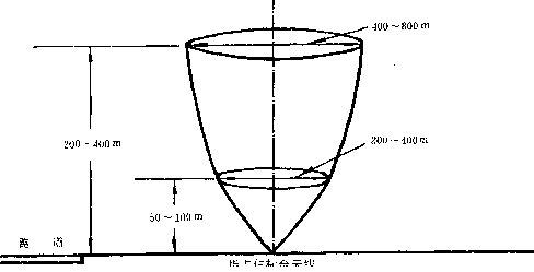 4.3.3 指點(diǎn)信標(biāo)臺(tái)向空中發(fā)射垂直扇型波束。其覆蓋區(qū)為,高度50—100m時(shí),縱向?qū)挾葹?00—400m;高度200—400m時(shí),縱向?qū)挾葹?00—800m(圖 5)。