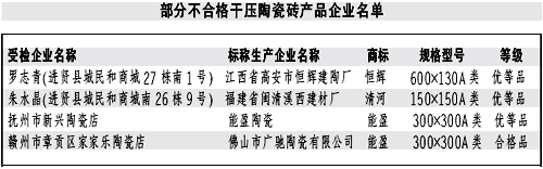 本報訊記者龔漢斌報道:近日,江西省質(zhì)監(jiān)局公布了近期對干壓陶瓷磚產(chǎn)品進行省級產(chǎn)品質(zhì)量監(jiān)督抽查的結(jié)果。質(zhì)監(jiān)部門共抽查了51家生產(chǎn)企業(yè)生產(chǎn)的52批次產(chǎn)品,抽樣合格率90.4%。抽查結(jié)果表明,本次抽查的陶瓷磚其放射性核素限量指標均達到了標準規(guī)定的要求;但仍有部分產(chǎn)品存在一些問題。