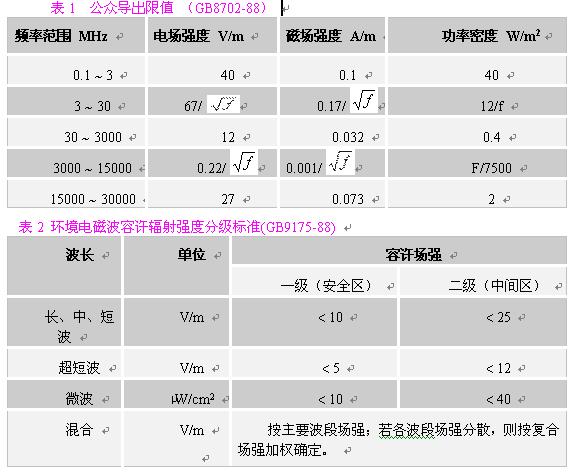 在對(duì)一般環(huán)境的電磁輻射分析中,應(yīng)主要選用《環(huán)境電磁波衛(wèi)生標(biāo)準(zhǔn)》主要選用《環(huán)境電磁波衛(wèi)生標(biāo)準(zhǔn)》(GB9175-88),根據(jù)輻射源的主要輻射頻率,參照表2,找到其輻射強(qiáng)度限值。注意掌握三個(gè)標(biāo)準(zhǔn)限值,一般我們把居民居住的環(huán)境按一級(jí)安全區(qū)處理,則其標(biāo)準(zhǔn)限值為:在長(zhǎng)、中、短波,電場(chǎng)強(qiáng)度應(yīng)小于10V/m;在超短波段,電場(chǎng)強(qiáng)度應(yīng)小于5V/m;在微波波段,其輻射功率密度應(yīng)小于10μW/cm2?紤]到對(duì)在電磁輻射環(huán)境內(nèi)工作人員的保護(hù),我們建議在職業(yè)安全衛(wèi)生領(lǐng)域,采用《電磁輻射防護(hù)規(guī)定》(GB8702-88)的相應(yīng)限值。